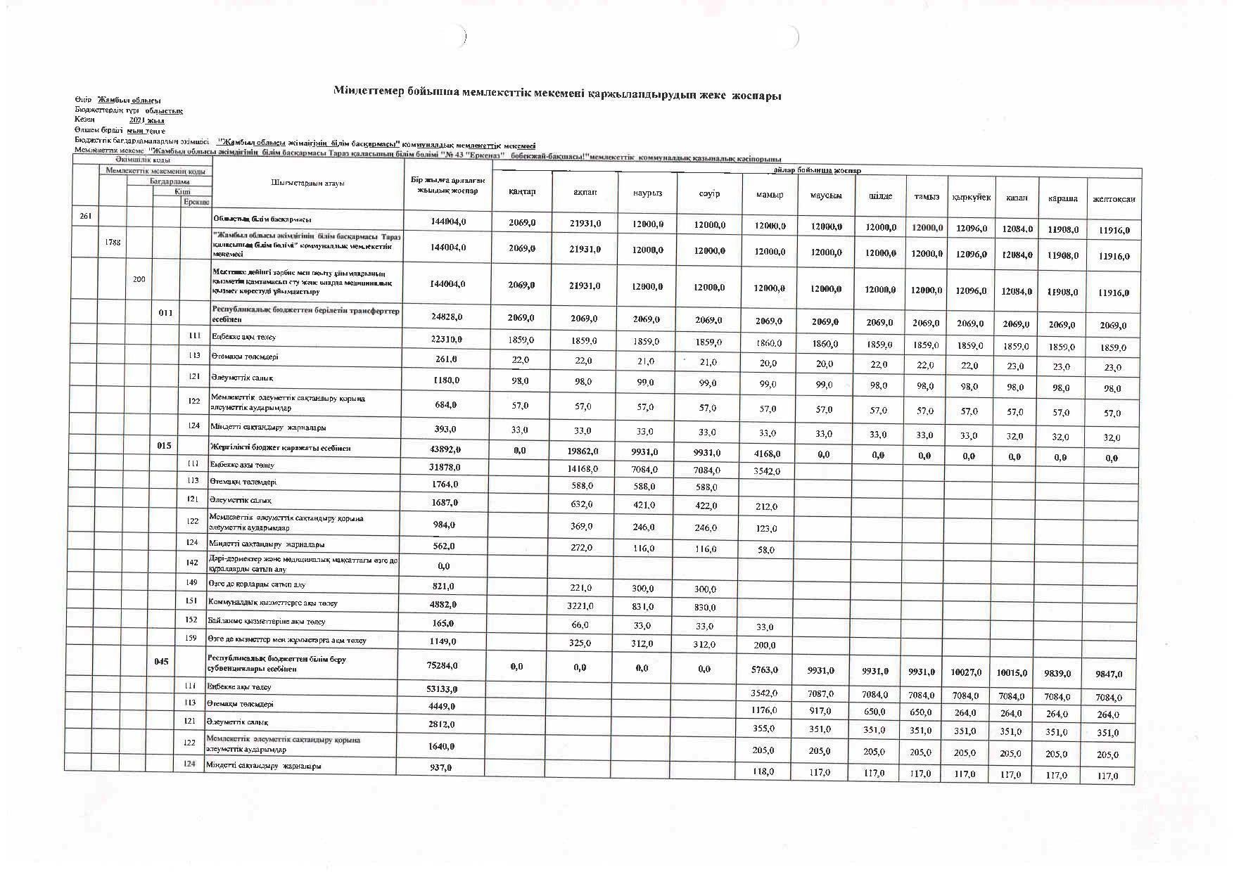 Міндеттемелер бойынша қаржыландырудың жеке жоспары 2021 » №43 "Еркеназ" бөбекжай-бақшасы