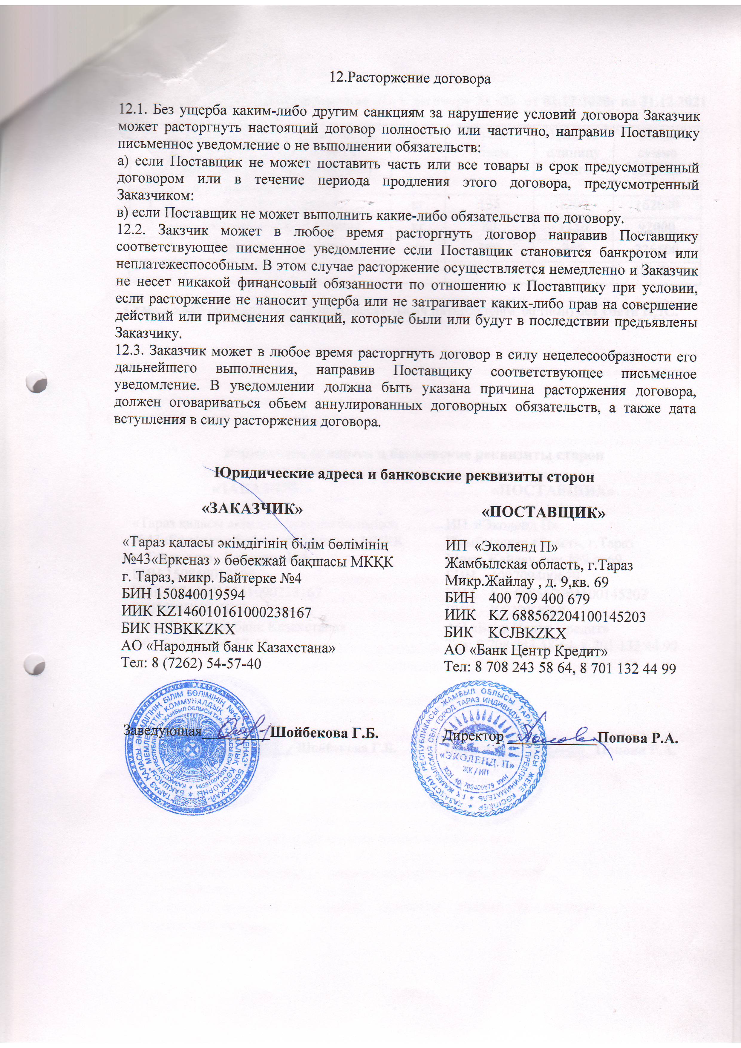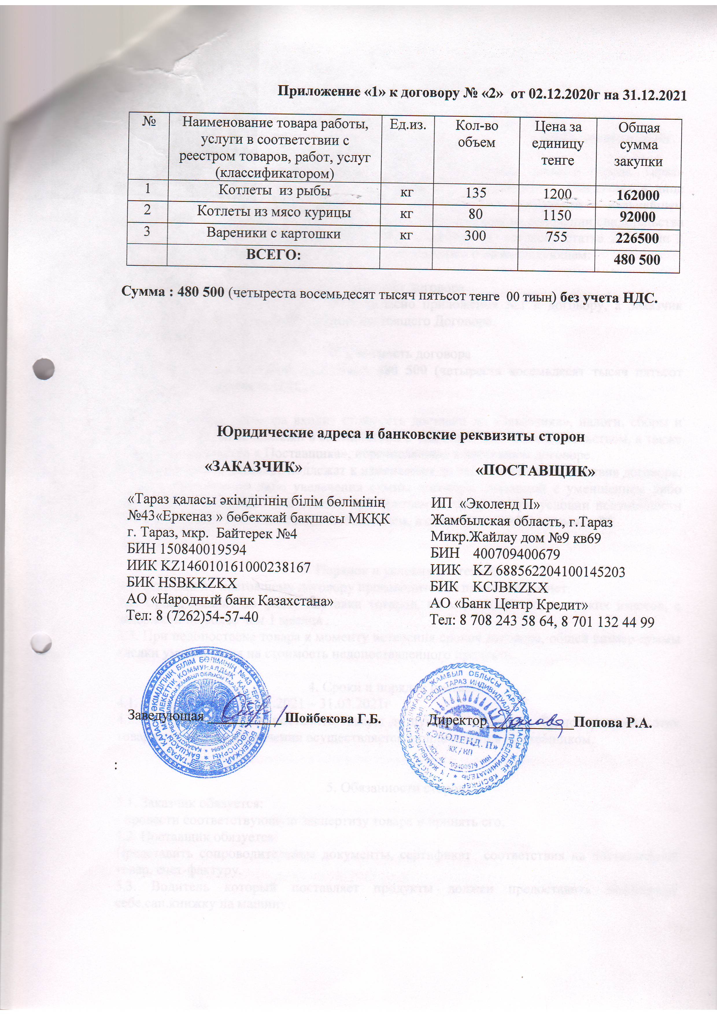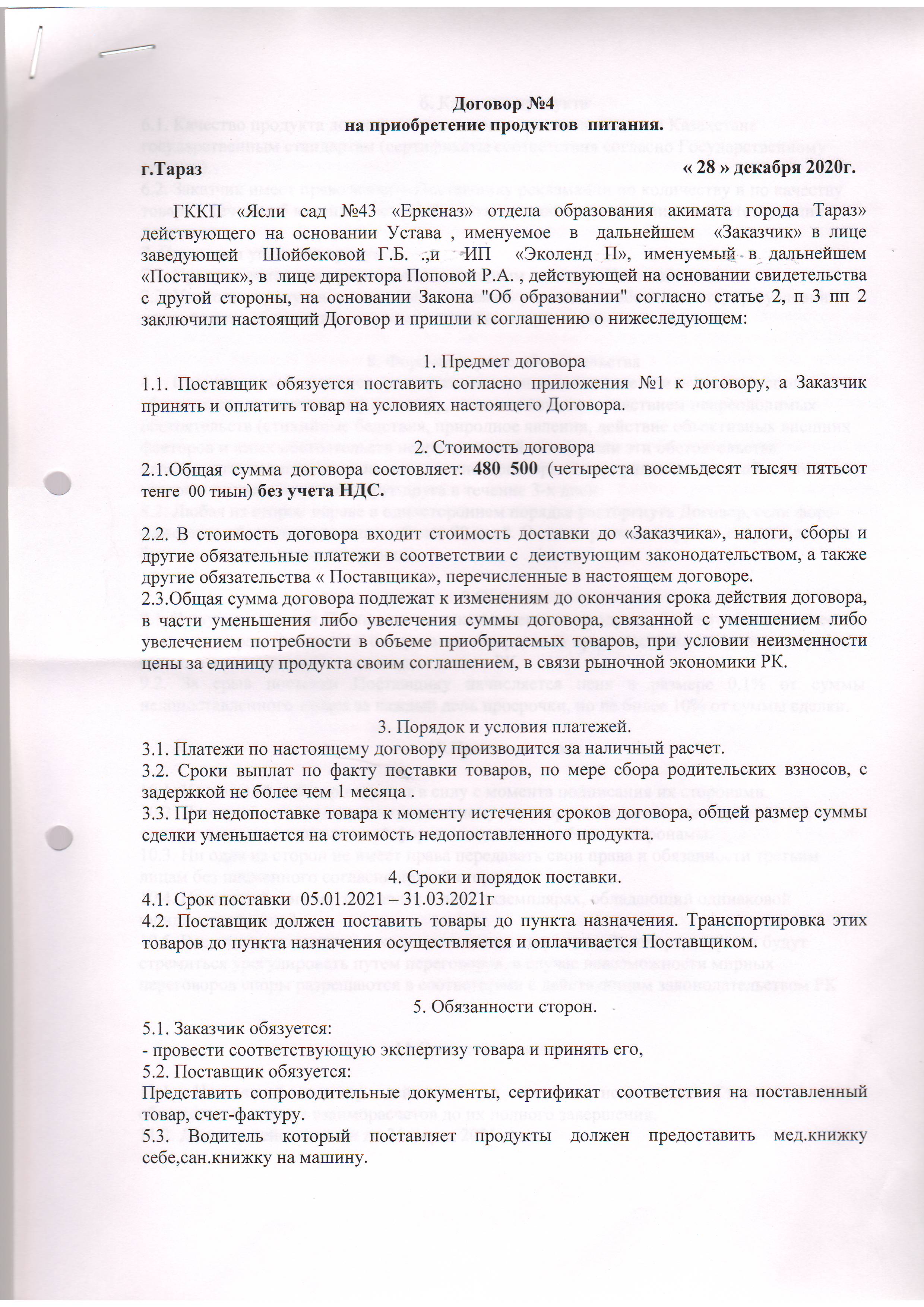 Договор питание №4 ИП Эколенд 2021 » №43 "Еркеназ" бөбекжай-бақшасы