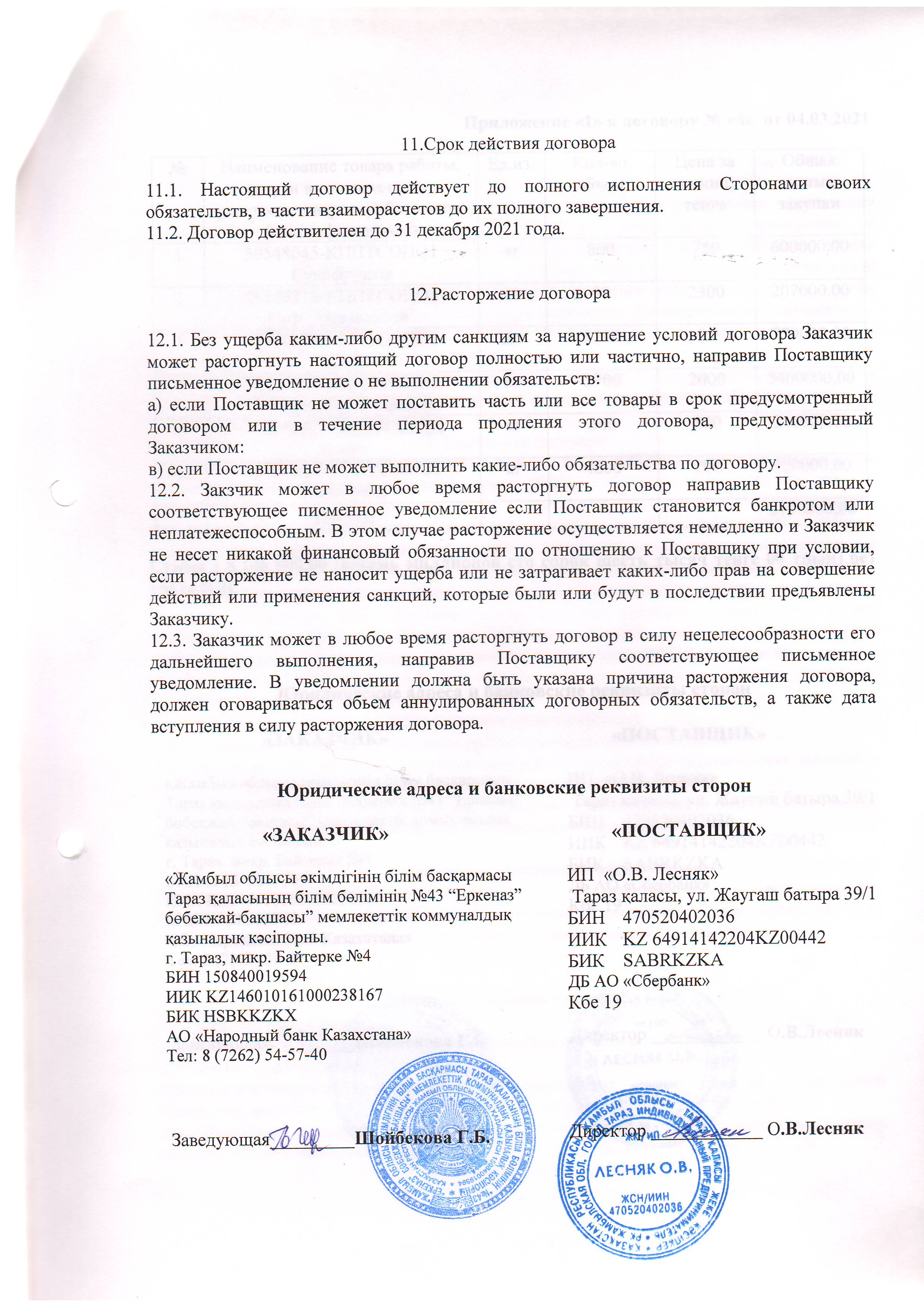 Договор питание №4 ИП Лесняк 2021 » №43 "Еркеназ" бөбекжай-бақшасы