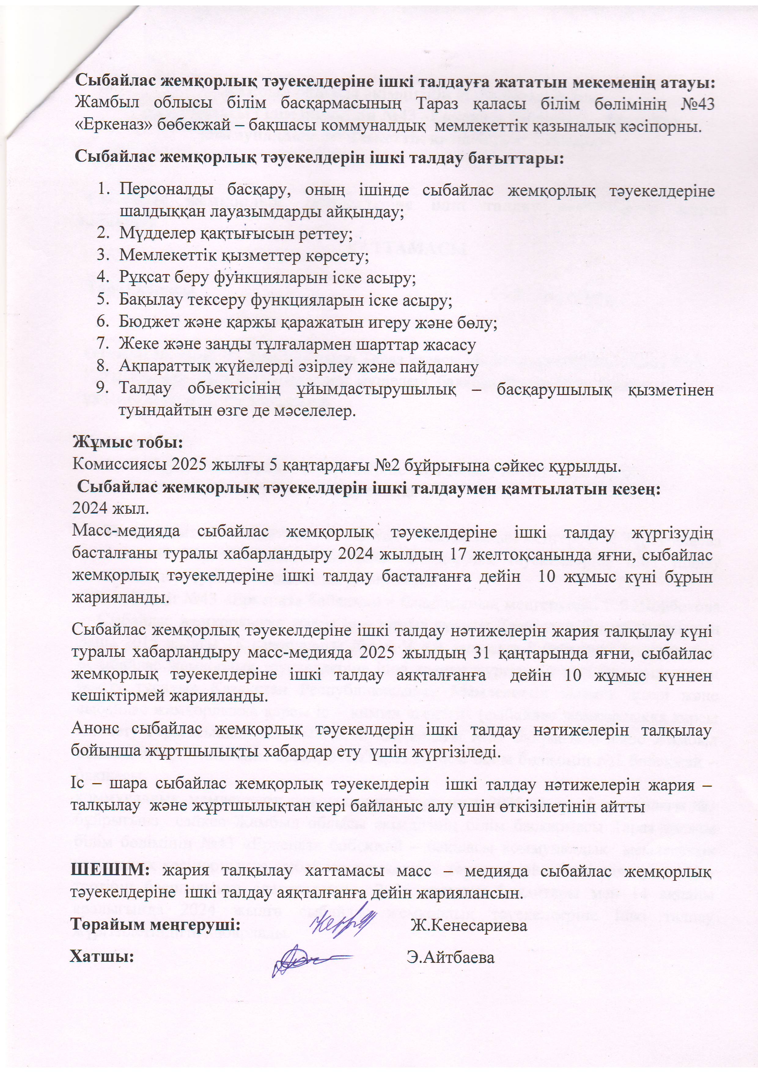 Сыбайлас жемқорлық тәуекелдеріне ішкі талдау нәтижелерін жария талқылау » №43 "Еркеназ" бөбекжай-бақшасы
